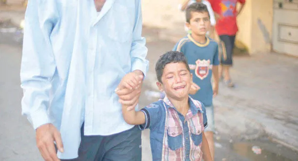 طفل يبكي بعد مقتل أربعة أطفال من عائلته (بكر) جراء سقوط قذيفة أطلقها زورق حربي إسرائيلي استهدفهم على شاطئ غزة أمس (رويترز)