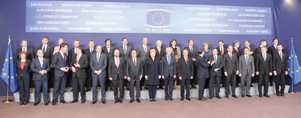 صورة جماعية لقادة دول الاتحاد الأوروبي في اليوم الأول من قمتهم في بروكسل أمس (أ.ب)