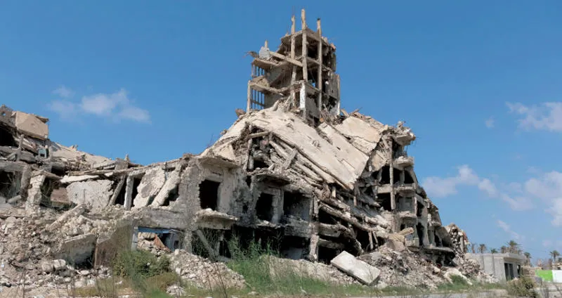 مبنى مهدم في حي الصابري في بنغازي حيث دارت معارك استمرت ثلاث سنوات بين قوات المشير حفتر وجماعات متشددة (رويترز)