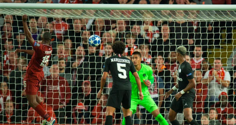 ستوريدج مهاجم ليفربول (يسار) يسجل برأسه في مرمى سان جيرمان (إ.ب.أ)