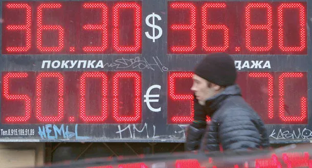 رجل يمر أمام محل للصيرفة في موسكو (رويترز)