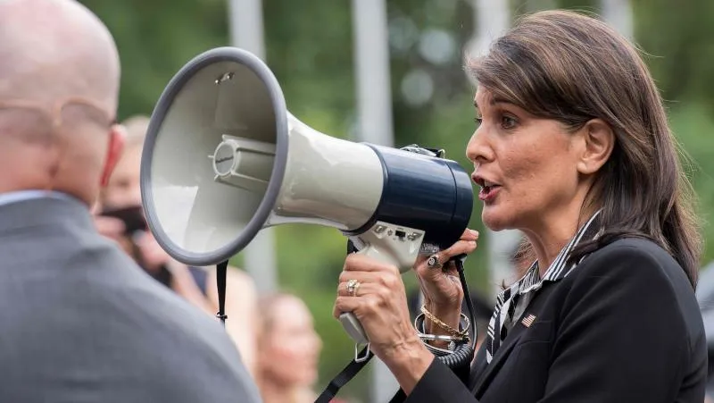 - شاركت السفيرة الأميركية في الأمم المتحدة نيكي هايلي التي تحمل رتبة وزير، أمس (الخميس)، في مظاهرة لمعارضين للرئيس الفنزويلي نيكولاس مادورو في نيويورك، حيث لم تتردد في حمل مكبر للصوت للمطالبة برحيله.