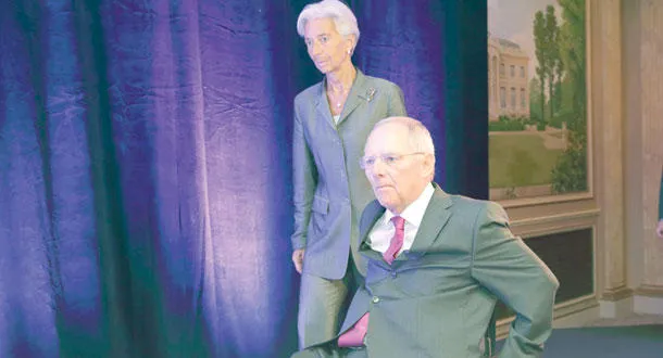 مديرة صندوق النقد الدولي كريستين لاغارد إلى جانب وزير مالية ألمانيا فولفغانغ شويبله أثناء مؤتمر حول مستقبل اليورو في باريس أمس (رويترز)