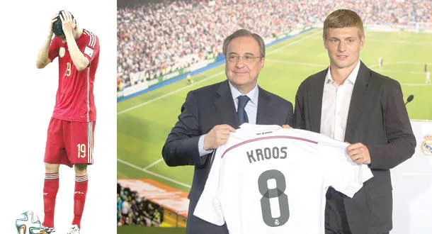 كروس الذي تألق مع المنتخب الألماني وإلى يساره رئيس ريـال مدريد بعد انضمامه للنادي الملكي مقابل 40 مليون دولار (أ.ب) - كوستا أخفق في المونديال وانضم لتشيلسي مقابل 55 مليون دولار (إ.ب.أ)