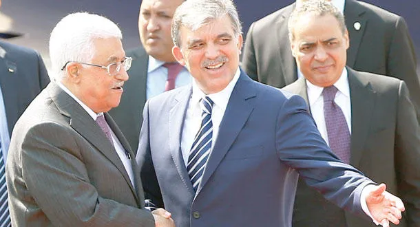 الرئيس التركي عبد الله غول يرحب بنظيره الفلسطيني محمود عباس في مطار أتاتورك باسطنبول أمس (رويترز)