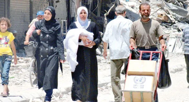 عائلة سورية تنقل صناديق حصلت عليها من منظمة الإغاثة الدولية والأونروا في مخيم اليرموك أمس (أ.ف.ب)