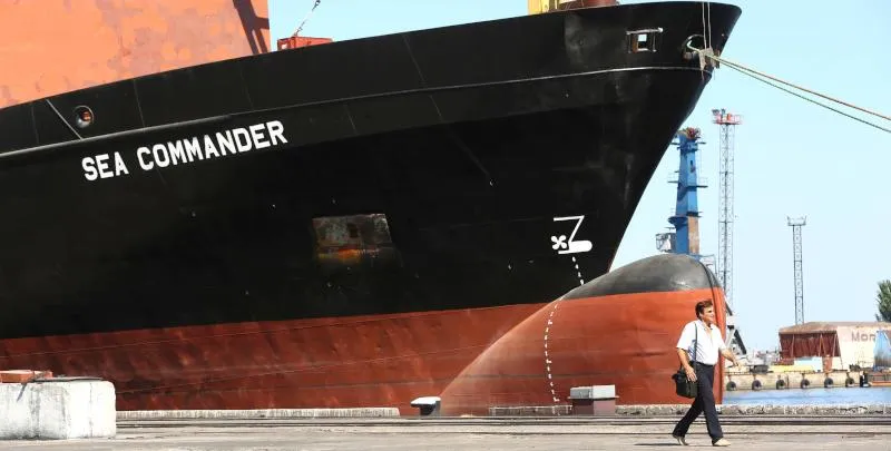 رجل يمشي في ميناء تجاري على بحر آزوف بين روسيا وأوكرانيا (أرشيفية - أ.ف.ب)