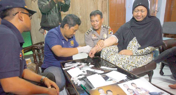 ضباط شرطة يأخذون عينة حمض نووي من عيدة ماردياتي شقيقة يولي هاستيني إحدى ضحايا الطائرة في سولو بجزيرة جاوة الإندونيسية أمس. وكانت يولي وزوجها واثنان من أولادهما على متن الطائرة المنكوبة (إ.ب.أ)