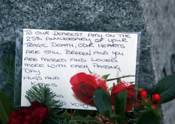 بطاقة مكتوبة بخط اليد على إكليل من الزهور وضعت على الحجر التذكاريّ الرئيس لضحايا تفجير طائرة بان آم الرحلة 103 في حديقة بمقبرة بالقرب من بلدة لوكيربي في أسكتلندا