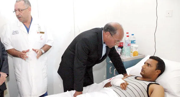 الرئيس التونسي المنصف المرزوقي خلال زيارته أمس جنديا أصيب خلال الأحداث الإرهابية الأخيرة التي شهدتها تونس الأربعاء الماضي والتي راح ضحيتها 15 قتيلا (أ. ب)