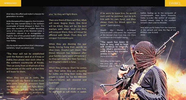 وقال محللون استخباراتيون أميركيون إنهم يفتقدون «إنسباير»، حيث كانوا يعدونها، بالحد الأدنى، «نافذة» تتيح لهم التعرف على طريقة تفكير تنظيم القاعدة في جزيرة العرب، مثلما يعرف عن نفسه التنظيم المتمركز في اليمن. وظهرت مجلة «إنسباير» لأول مرة في يوليو (تموز) 2010، وتعد واحدة من أبرز الوسائل الدعائية لـ«القاعدة»، إذ إنها كانت تصدر باللغة الإنجليزية وتحتوي على صور ملونة ومقالات تستهدف القراء الأميركيين والأوروبيين للتأثير على أفكارهم. ويبدو العدد الأول من مجلة «دابق» وكأنه في موقع المنافسة مع كبريات المؤسسات العالمية.