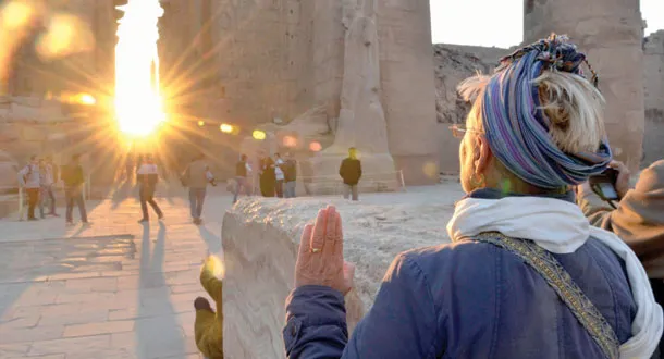 مئات السائحين يتابعون تعامد الشمس على الإله آمون في معبد الكرنك