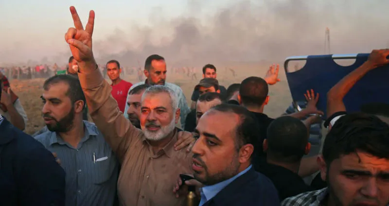 اسماعيل هنية يرفع شارة النصر في أحد شوارع غزة (أ.ف.ب)