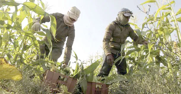 أجنبيان يعملان في مزرعة بمنطقة الرياض حيث تعتمد غالبية المهن البسيطة على الأجانب (رويترز)