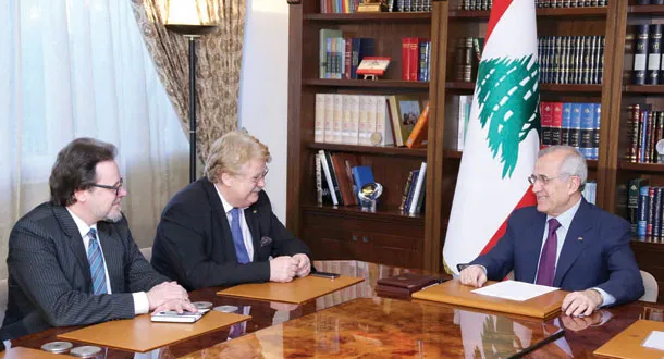الرئيس اللبناني ميشال سليمان لدى لقائه في بيروت أمس رئيس لجنة الشؤون الخارجية في البرلمان الأوروبي ألمار بروك (دالاتي ونهرا)