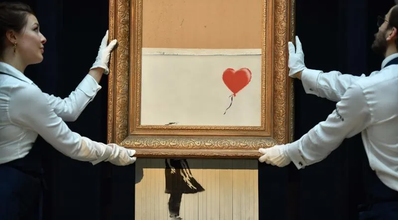 ومزقت لوحة «فتاة وبالونة» لبانكسي نفسها بشكل جزئي فور بيعها مقابل 1.37 مليون دولار أميركي قبل نحو أسبوعين، مما أثار حالة من الذهول داخل قاعة عرضها بدار سوذبيز للمزادات في لندن، قبل أن يتضح لاحقا أن بانكسي زرع آلية لتمزيقها داخل الإطار.
