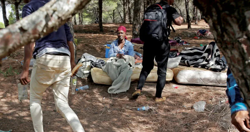 مهاجرون أفارقة في مخيم مؤقت بمنطقة جبلية قريباً من طنجة بالمغرب (رويترز)
