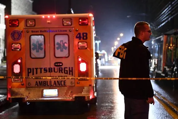 ضابط من مكتب التحقيقات الفيدرالي خلف حاجز أمني وسيارة إسعاف أمام المعبد اليهودي في مدينة بيتسبرغ (ا.ف.ب)
