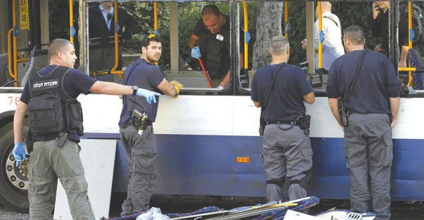 عناصر شرطة إسرائيليون يعاينون حافلة تعرضت لأضرار بعد انفجار قنبلة بداخلها في ضواحي تل أبيب دون إصابات أمس (أ.ب)