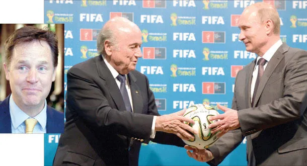 بلاتر رئيس الفيفا خلال تسليمه الكرة إلى الرئيس الروسي بوتين في البرازيل مع بداية العد التنازلي لتنظيم مونديال 2018 (أ.ب) و كليغ نائب رئيس الوزراء البريطاني