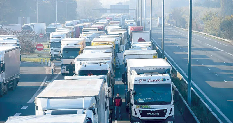 احتجاج الشاحنات على الطرق السريعة في فرنسا يوم الأربعاء الماضي (أ.ف.ب)