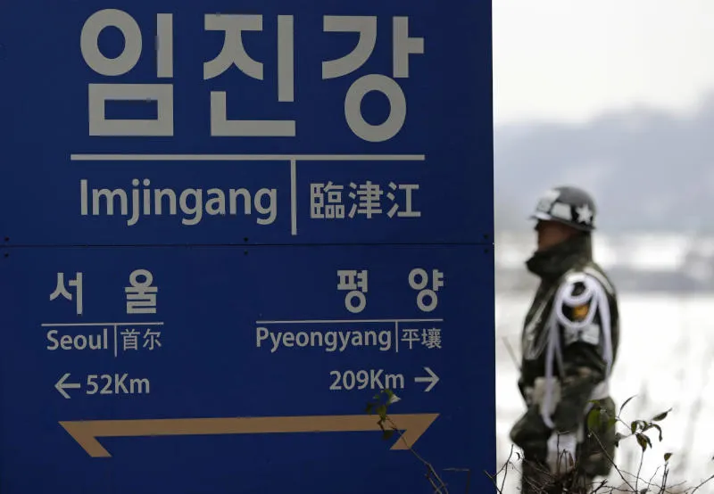 جندي كوري جنوبي يقف بالقرب من لافتة تظهر المسافة إلى العاصمة الكورية الشمالية بيونغ يانغ وإلى سيول (أ.ب)