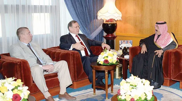 الأمير متعب بن عبد الله وزير الحرس الوطني السعودي لدى لقائه السفير الروسي أمس (واس)