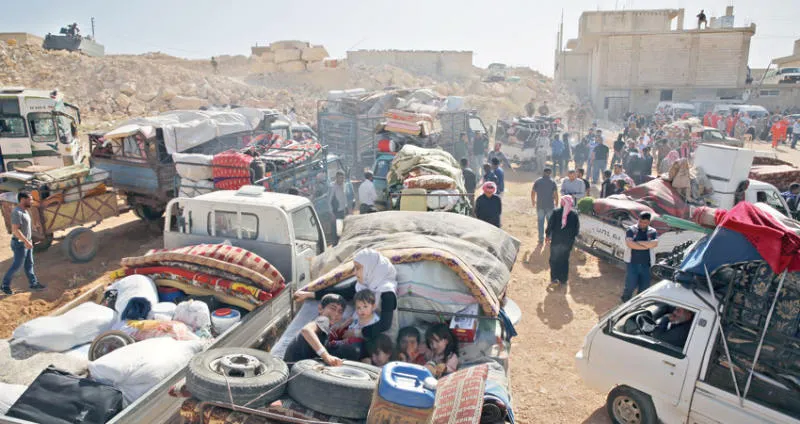 نازحون سوريون يغادرون عرسال في يونيو الماضي (إ.ب)