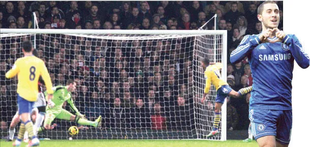 هازارد لاعب تشيلسي يحتفل بهدف الفوز الوحيد أمام سوانزي سيتي والكوت لاعب آرسنال خلال تسجيله أحد أهداف فريقه في مرمى ويستهام (أ.ف.ب)