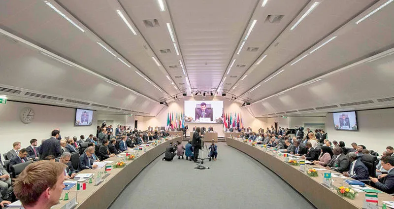جانب من اجتماع وزراء طاقة تحالف «أوبك+» في فيينا أمس (أ.ف.ب)