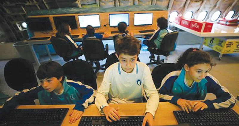 طلاب في حصة دروس الحاسوب بالطائرة في حديقة مدرسة بتركيا