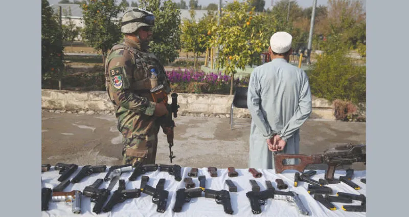 أحد عناصر حركة {طالبان} بعد اعتقاله في جلال آباد وخلفه أسلحة مصادرة (إ.ب.أ)