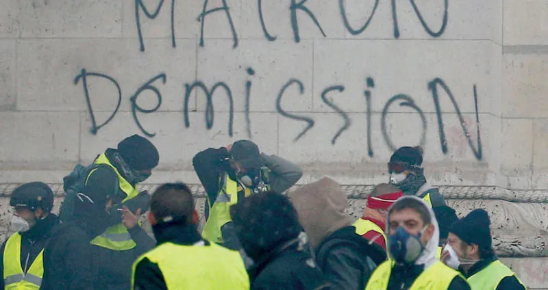 جانب من المحتجين بستراتهم الصفراء يقفون أمام حائط وسط شوارع باريس كتبت عليه عبارة «ماكرون استقِل» (رويترز)
