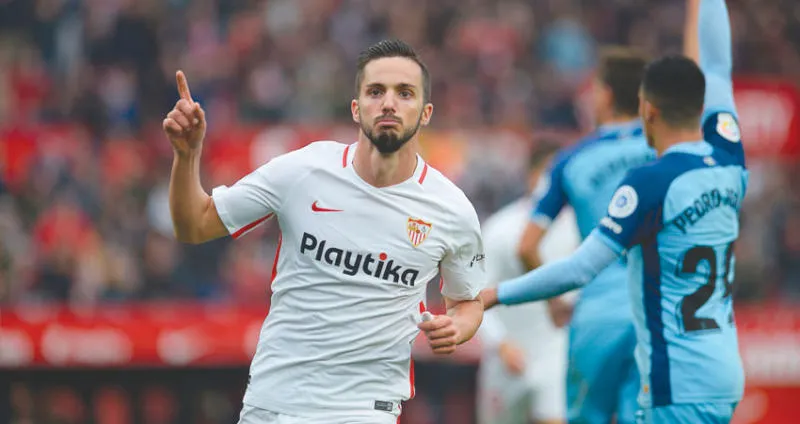 بابلو سارابيا لاعب إشبيلية يحتفل بالتسجيل في مرمى جيرونا (أ.ف.ب)