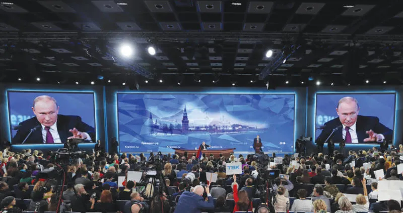 وجه الرئيس الروسي فلاديمير بوتين رسائل عدة خلال مؤتمره الصحافي السنوي الشامل أمس، حملت تطمينات إلى الداخل الروسي بأن الوضع الاقتصادي بدأ يميل إلى التعافي رغم العقوبات والضغوط الغربية، وعكست تحديا على المستوى الخارجي لما وصفه بأنه «محاولات إضعاف بلادنا، لأنها نجحت في استعادة قدراتها».
