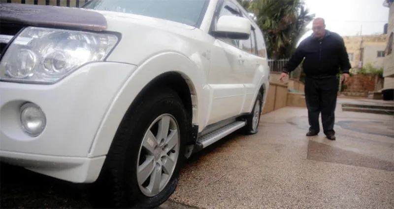 فلسطيني يعاين إطارات سيارته التي ثقبها مستوطنون متطرفون في القدس (وفا)