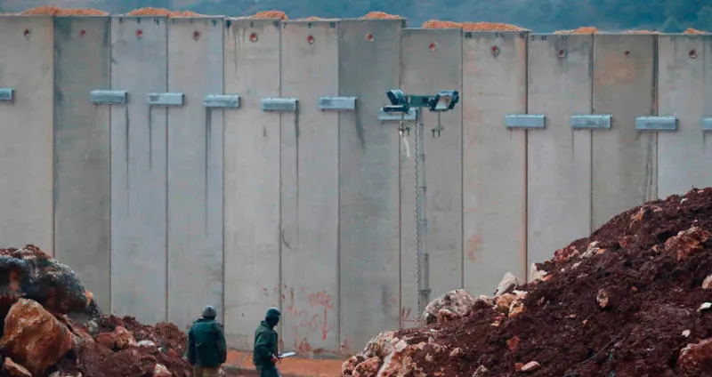 جنديان إسرائيليان قرب جدار اسمنتي ثبتته إسرائيل قرب حدودها مع لبنان (أ.ف.ب)