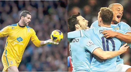 لاعبو مانشستر سيتي يحتفلون بهدف دزيكو الثمين في كريستال بالاس و حارس مرمى كرستال بالاس يقذف الكرة بعيدا عن مرماه (أ. ب)