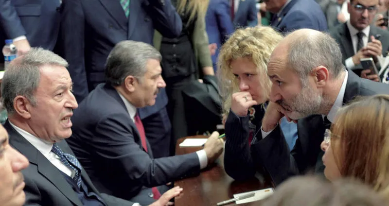 وزير الدفاع التركي خلوصي أكار (يسار) يتحدث في أنقرة أمس عن عملية محتملة شرق الفرات (أ.ب)
