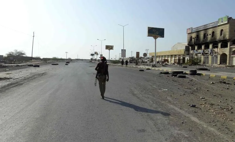 مقاتل يمني تابع للقوات الموالية للحكومة يمشي ببندقية في مدينة الحديدة (أ.ف.ب)