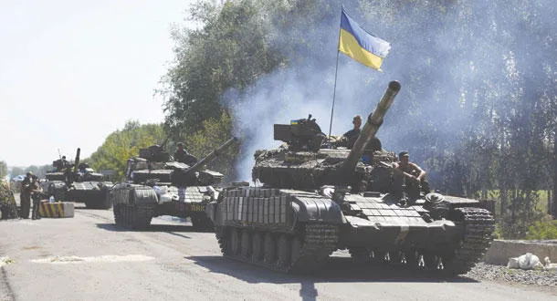 دبابات أوكرانية تقصف مواقع المتمردين في جولة قتال جديدة بين القوات الأوكرانية الحكومية والمقاتلين الانفصاليين الموالين لروسيا حول مدينتي لوجانسك ودونيتسك في شرق البلاد أمس (أ.ف.ب)