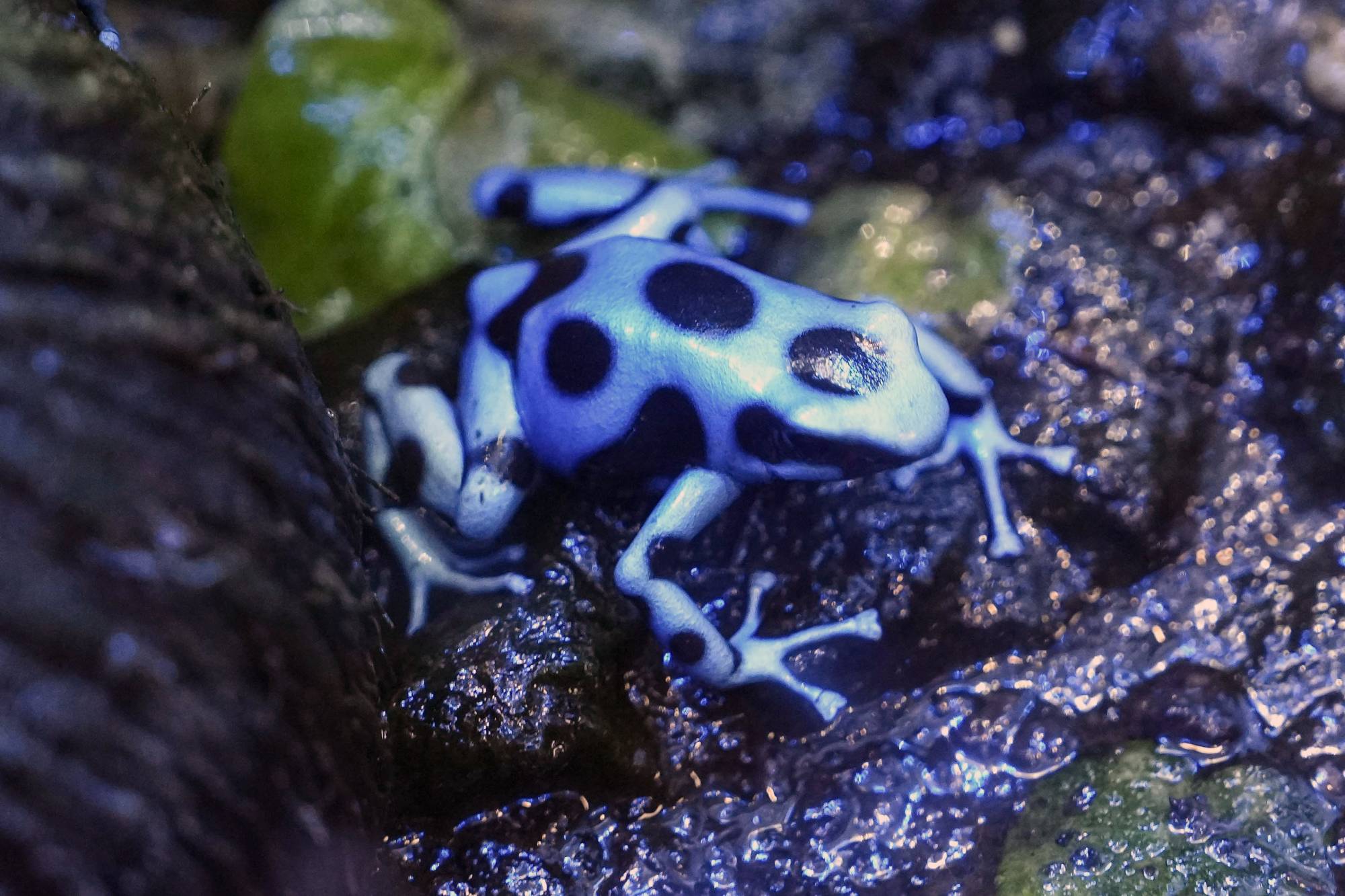 أحد ضفادع السهام السامة الزرقاء معروضاً في حوض أسماك ببرشلونة 16 فبراير 2026 (إ.ب.أ)