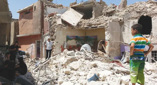 عراقيون يعاينون الدمار الذي خلفه قصف لطيران الجيش في الموصل أمس (إ.ب.أ)