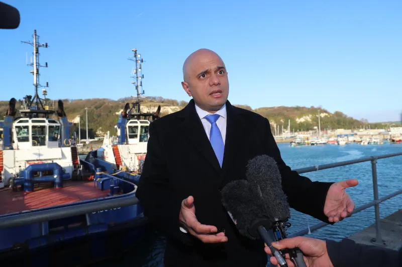 وزير الداخلية ساجد جاويد يتحدث لوسائل الإعلام من مدينة دوفر الساحلية (إ.ب.أ)