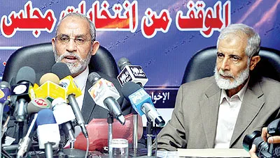 صورة أرشيفية لمرشد الإخوان محمد بديع مع نائبه آنذاك محمود عزت في مؤتمر صحافي بالقاهرة في عام 2010 (إ.ب.أ)