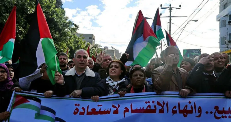 تظاهر آلاف الفلسطينيين في غزة ورام الله أمس للمطالبة بإنهاء الانقسام الفلسطيني الداخلي المستمر منذ 11 عاما ووقف الاحتقان الداخلي المتزايد.