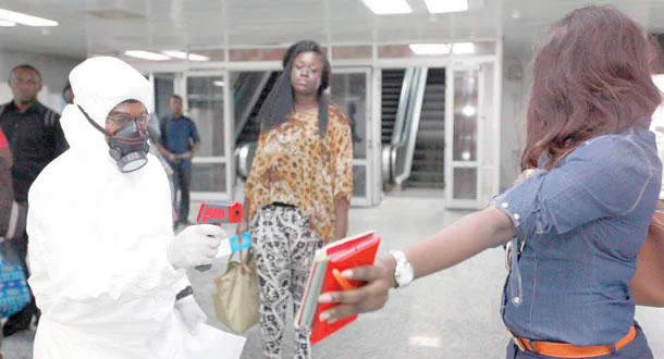 مسؤول صحفي في مطار لاغوس يرشد مسافرة إلى الإجراءات المتبعة تفاديا لانتشار المرض (أ ب)