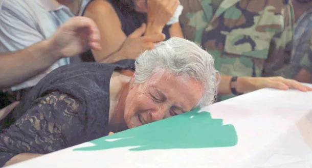 جدة المقدم في الجيش اللبناني داني حرب الذي قتل في معارك مع مسلحين في عرسال تبكي على نعشه خلال جنازته في بيروت أمس (رويترز)