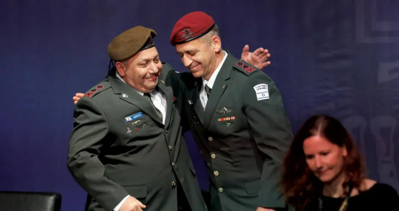 رئيس الأركان الإسرائيلي الجديد (يمين) مع سلفه خلال حفل تسليم وتسلم في تل أبيب أمس (إ.ب.أ)