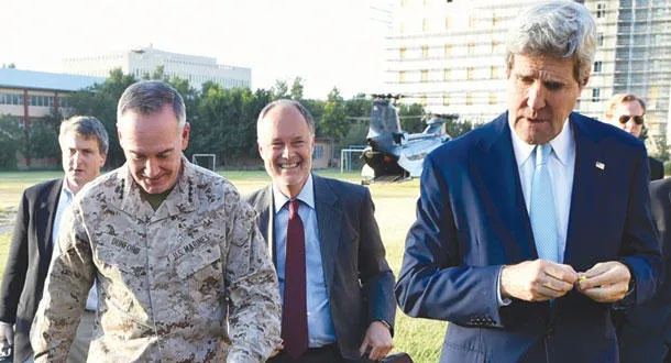 قائد القوات الدولية في أفغانستان الجنرال جوزيف دانفورد يستقبل وزير الخارجية الأميركي لدى وصوله إلى كابل أمس (إ.ب.أ)